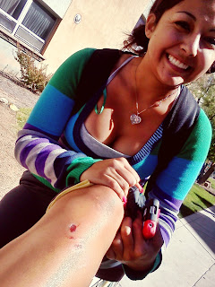 Sometimes, this random laziness sweeps over me and I don't feel like doing anything, including walking. Lackadaisical should be my middle name. Today, the laziness feeling returned when two of my friends, Torey and Joslyn, and I walked out of Music Appreciation and were going to eat lunch together. I realized they were riding their bikes, and I was going to have to walk behind them. Man, seriously? I did not want have to run to catch up to them, because I know them and I knew they would peddle fast just to make it impossible for me. Joslyn's bike has this adjustable rack right behind the seat of the bicycle. I selfishly hopped on the rack and Joslyn proceeded to peddle double her weight, surprisingly with very little complaints. If I were her, I would have complained the whole time. While Joslyn and I were cycling around campus -- well she was doing the labor; I was leisurely enjoying the ride -- many students, probably everyone we passed by, and myself were laughing hysterically at how frivolous we must have looked. In order to not have to go down any stairs, we went down this tricky handicapped ramp. There were speed bumps on the ramp, and she rode over them, almost knocking me off of the bike. I held on to her in an attempt to stabilize myself, and when I did that, she also lost her balance and we rode into a wide pole and fell. We sustained injuries such as scrapes, cuts and bruises on our shins, ankles and knees, but I think the thing that was hurt the most was our pride. Two people, not including Torey, witnessed the scene and came over to ask if we were okay while simultaneously laughing their asses off. Tears were rolling down my cheeks, and I couldn't see anything, but not because of the pain, even though there was plenty of that going on. I was laughing the hardest I had laughed in long, long time.